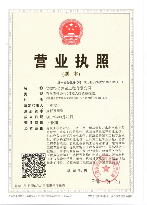 安徽拓金建設(shè)工程有限公司成立于2017年9月,正值金秋收獲季節(jié),公司目前注冊(cè)資金500萬(wàn)元。
